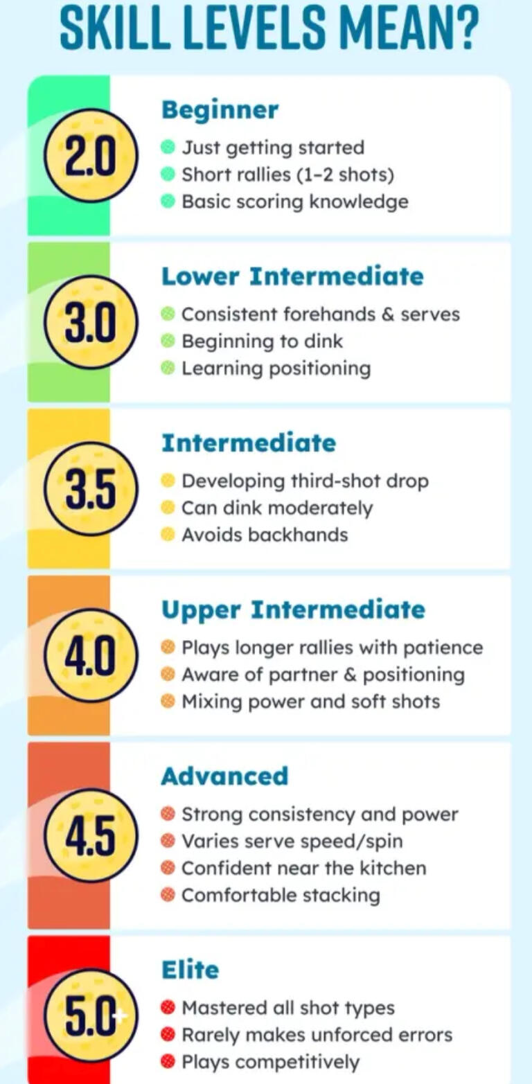 Before you get an official rating from tournaments, DUPR, or our resident pro- here is a handy guide to self rate. To play in any open plays 3.75 or higher, you must have an official rating.